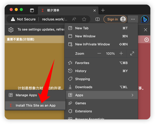- 在Edge浏览器中打开《朝夕清单》Web应用 http://recluse.work/app/ ,然后通过以下示例安装PWA应用